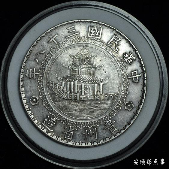 该币设计新颖别致、铸工甚为精湛,正面中央为贵阳有名的甲秀楼风景图,上环为“中华民国三十八年”字样,下环为“贵州省造”字样,在楼柱的右侧下特别铸了一个很小的“谷”字,该字很隐蔽,只有仔细察看才能发现;此“谷”字是谷正伦费尽心机策划的,目的是要显耀一下自己的家姓,以传播黔中内外甚至整个中华大地,这种银元存世稀少,已成珍品,现在只有在一些大型的银币拍卖会上才偶有露面。