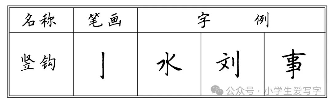 与横勾相同,竖钩也是复合笔画,它是在竖画的基础上加上向左上的勾画。书写时,首先写竖画,竖画行至末端,向左下顿笔,直接向左上勾出。