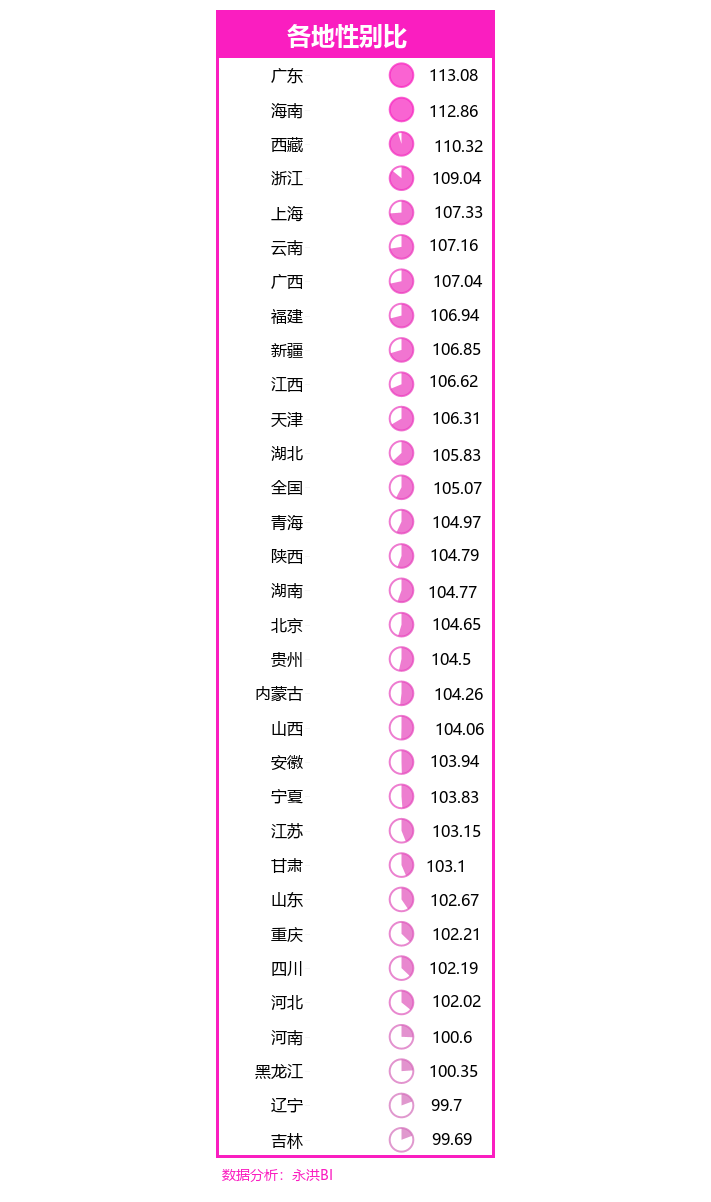 从地区男女比例来看,全国只有辽宁和吉林的男性占比少于女性;浙江、上海、广东、广西、海南的男女比例已经高出正常范围了;福建、云南、新疆的男女比例也在正常值边缘徘徊。
