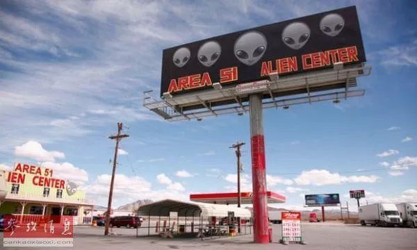 ▲资料图片:美国内华达州“51区”附近的一处加油站,牌子上写着“51区,外星人中心”。(英国《卫报》网站)