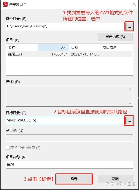 3)找到需要导入的ZW1格式的文件所在的位置,并打开。【目标目录】这里使用的是默认的位置(也可以指定一个位置),点击【确定】开始恢复