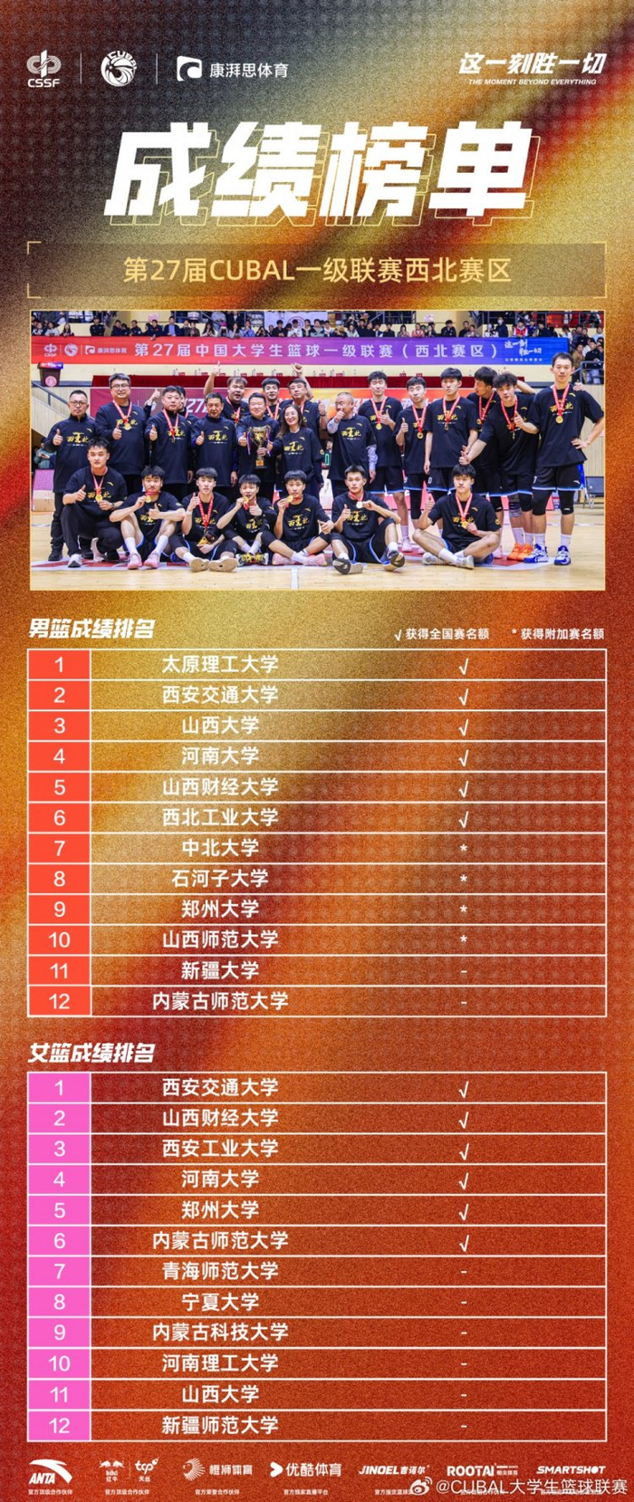 女篮方面,西安交大、山西财大、西安工大、河南大学、郑州大学、内蒙师大锁定女子全国大赛。男篮方面,太原理工、西安交大、山西大学、河南大学、山西财大、西北工大率先锁定男子全国大赛。中北大学、石河子大学、郑州大学、山西师大落入附加赛。